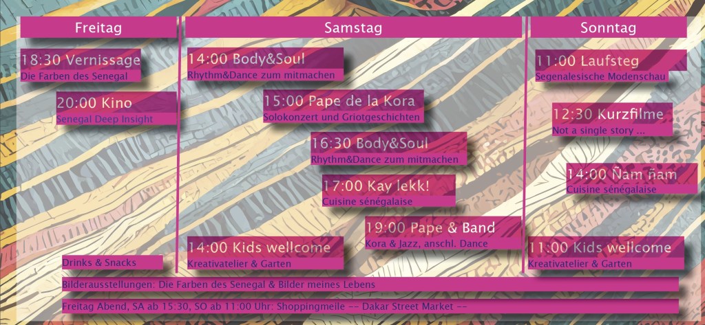 Kulturwochenende in der KUFA Bamberg Heute schon an Juni denken und Vorfreude bekommen! Gemeinsam mit ‚fränkischen Senegalesen‘ veranstalten wir im kommenden Frühsommer ein festliches und fröhliches Wochenende, das wir ganz unserem Partnerland widmen möchten. Ihr seid heute schon herzlichst eingeladen und Ihr könnt uns für dieses Fest unterstützen: Spendet uns! Auch 10€ oder mehr helfen… Weiterlesen Die Farben des Senegal