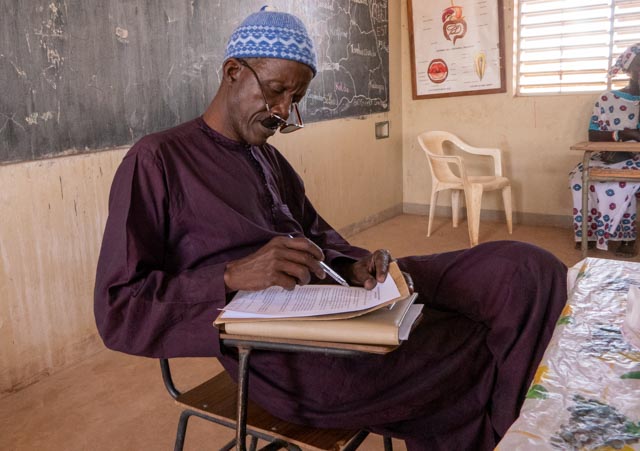 Beim nächsten Gebäude empfängt uns Monsieur Fall, der Bauleiter unseres Projektes ‚Ein Platz für Bildung‘. Er hat die Konstruktionspläne und allerhand Zahlen mitgebracht und erläutert fachmännisch die bisherigen Schritte der Sanierung der Vorschulklasse. Wichtigster Schritt war zu Beginn, die Statik des Gebäudes zu stabilisieren und entsprechende Betonpfeiler einzuziehen. Zudem konnte von der ersten Geldspende auch bereits der Boden repariert werden. – Geplant sind weiterhin, das Dach vor der Regenzeit zu reparieren, Fenster einzusetzen sowie die Wände zu streichen. Bis die nächste Spendenrate eingeht, steht der Bau nun erstmal still.