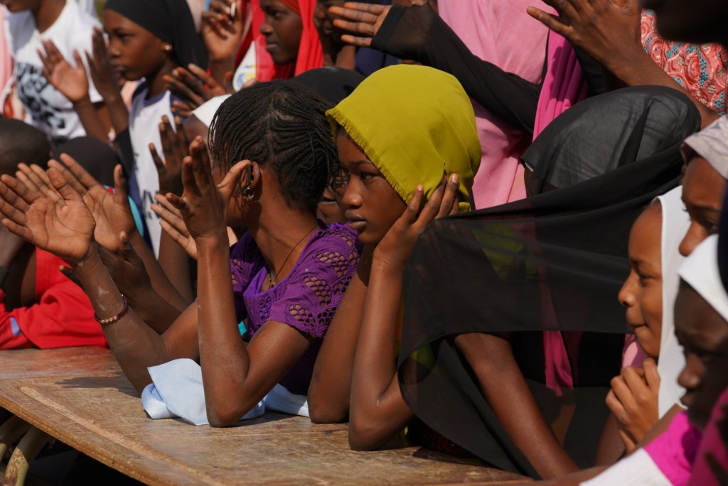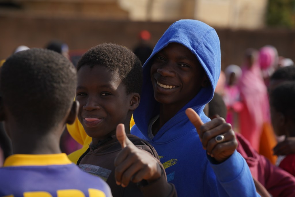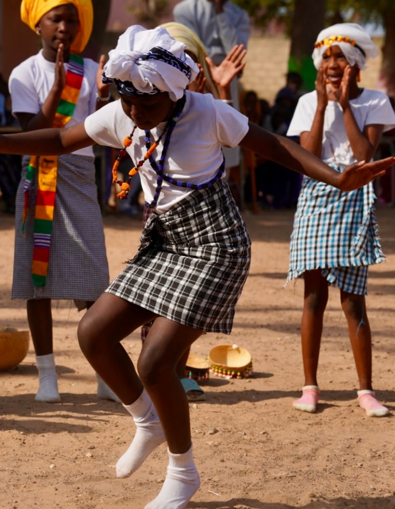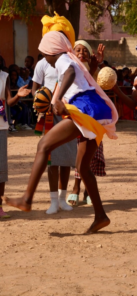 Nun laufen wir durch das Schultor und werden von einem Spalier von Jungen und Mädchen empfangen. Sie klatschen und winken und rufen und strahlen uns an. Wir sind in unserer Partnerschule Keur Dieumb.